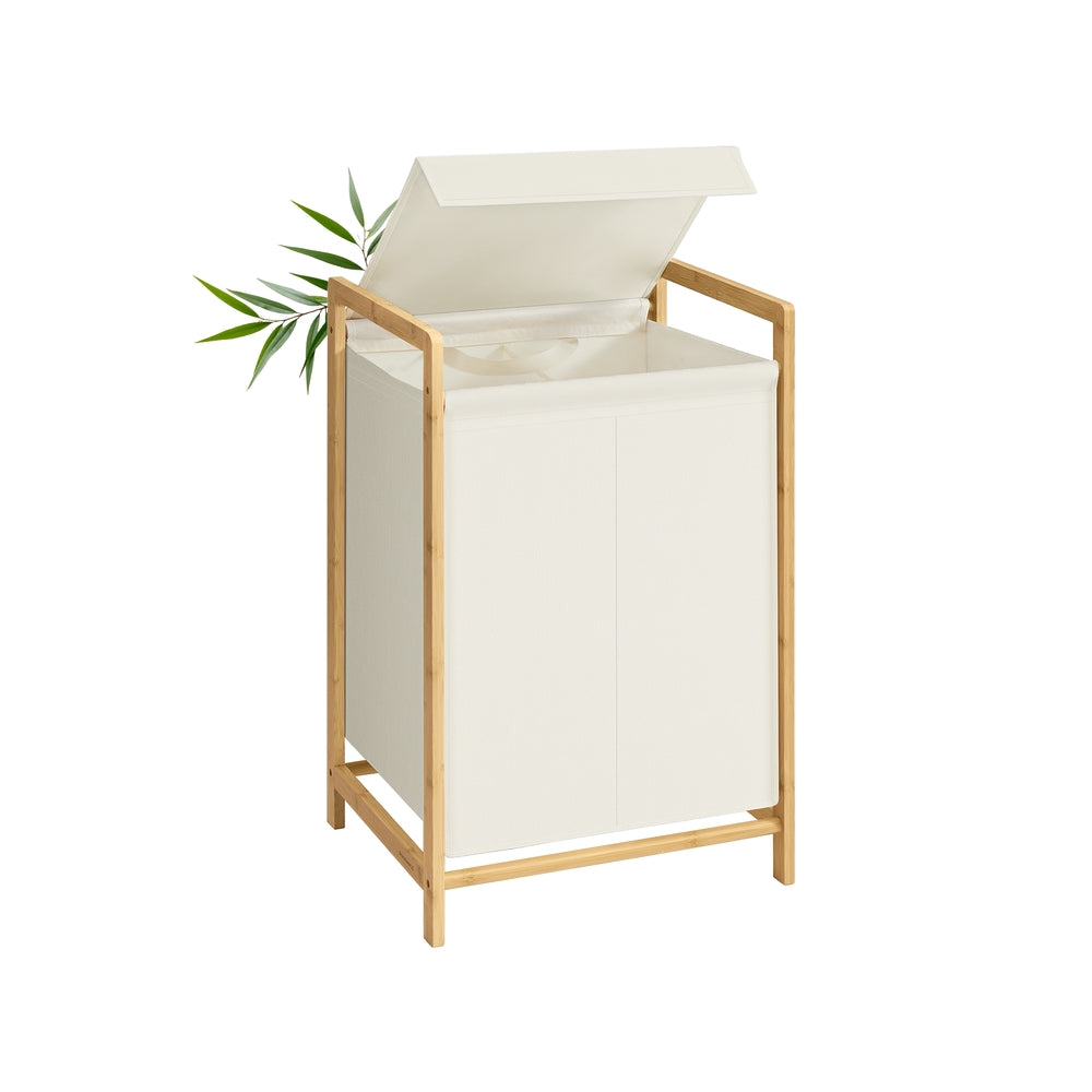Panier à linge 2 compartiments structure en bambou couvercle renforcé sac amovible 100 L blanc crème