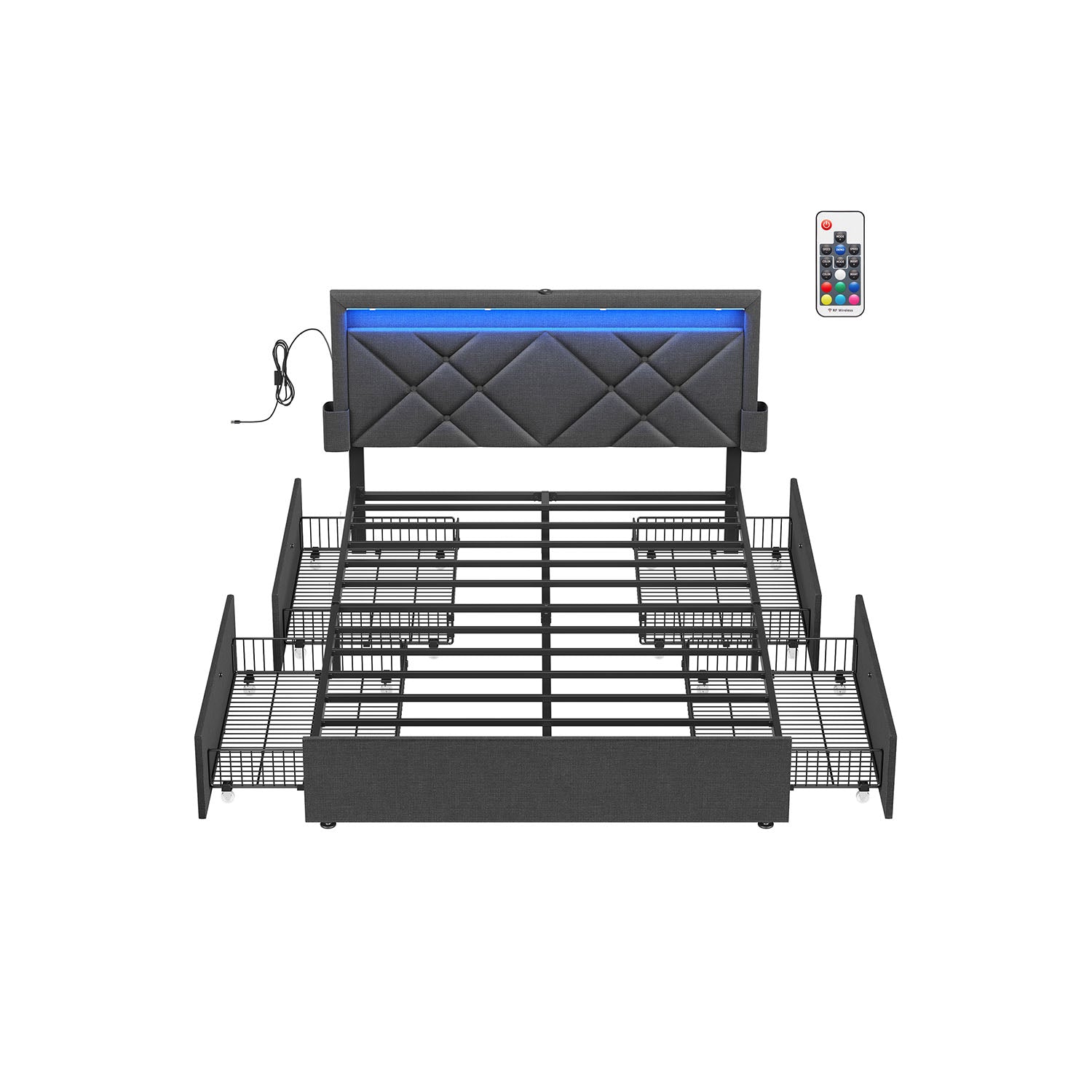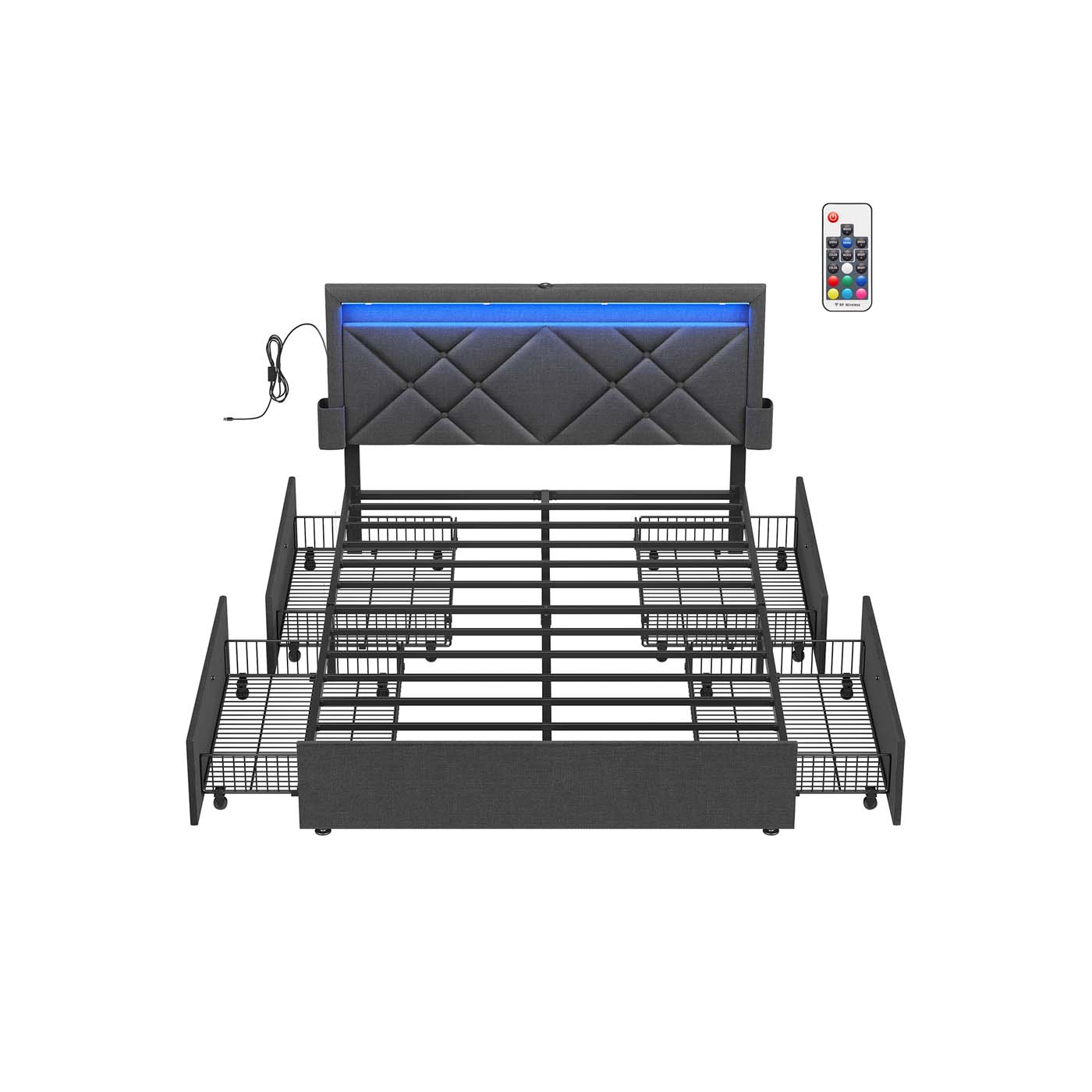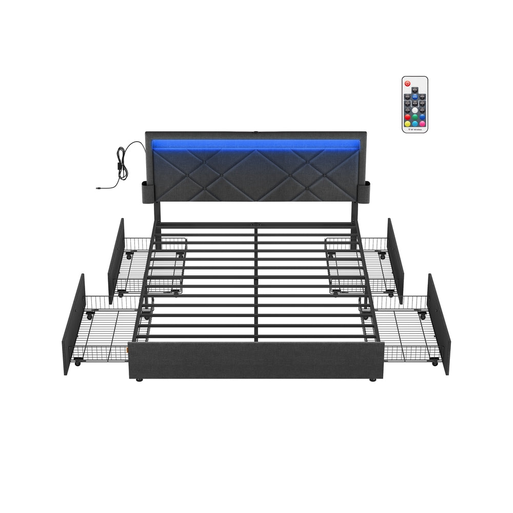 Lit double 160 x 200 cm avec LED en métal 4 tiroirs multiprise tête de lit rembourrée gris ardoise et noir mat