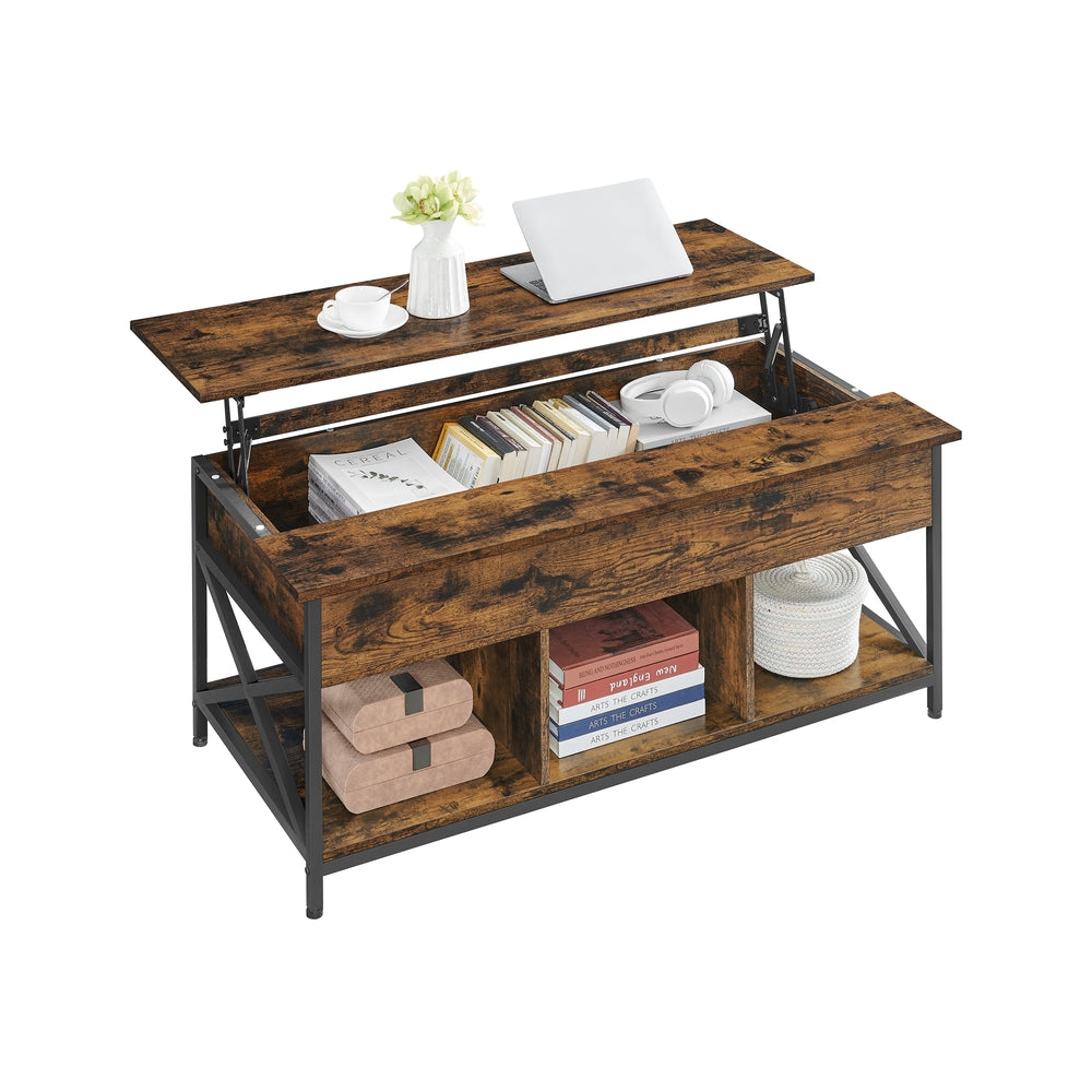 Table basse avec plateau relevable barres en forme de X marron camel et noir